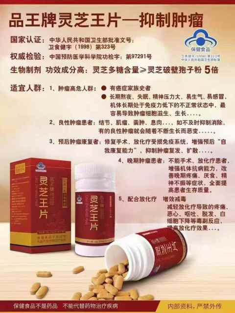 灵芝王片是国家卫生部批准的正规保健食品,易吸收、功效成分高于灵芝孢子粉5倍以上长期服用可增强机体免疫力,预防各类疾病发生。因为免疫功能低下是万病之源!